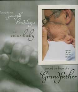 The New Grandfather photo frame plaque is a thoughful gift for a new grandfather. It holds a 4 x 6 inch picture of the new baby. The black and white frame plaque is 10.5 x 10.5 inches. The frame plaque shows a baby's hand grasping an adult's finger with a heart-warming verse: "Among the most powerful handclasps is a new baby around the finger of a Grandfather." © Creative Products Inc.Give it to a new grandpa as a remembrance of the special new addition to the family. It can be displayed on a table or shelf using an easel (not included), or hung on the wall. Product InfoSize: 10.5 x 10.5 inches square; holds a 4 x 6 inch photo Other: Designed in the USA Read more...